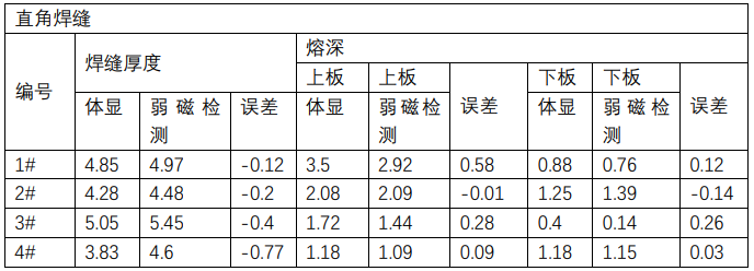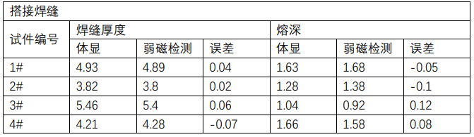根据实验设备切割检测结果与弱磁焊缝质量检测仪结果分析验证,发现搭接焊缝关键尺寸测量误差普遍较小,高度吻合。